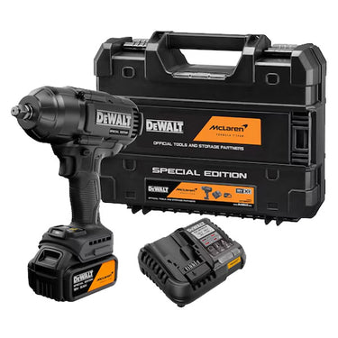 This kit includes the DeWalt x McLaren F1 Edition Impact Wrench, a 5Ah battery and a charger supplied in a special edition TSTAK carry case.