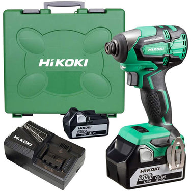 This kit includes the HiKOKI WH18DBFL2 Brushless Impact Driver, two 5.0Ah batteries, a charger and a carry case.