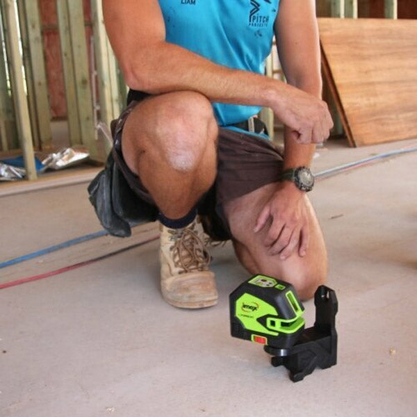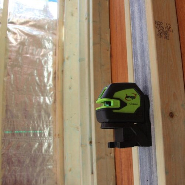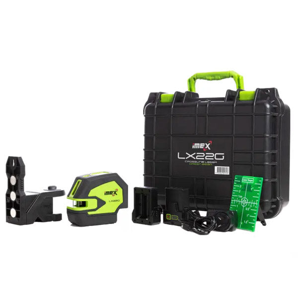 The iMEX LX22G cross line laser level features ultra-bright green beam technology with one horizontal and one vertical line, plumb up and plumb down. Series II features an all-new sturdy magnetic bracket enabling quick release of the laser without screws to hold it in place.