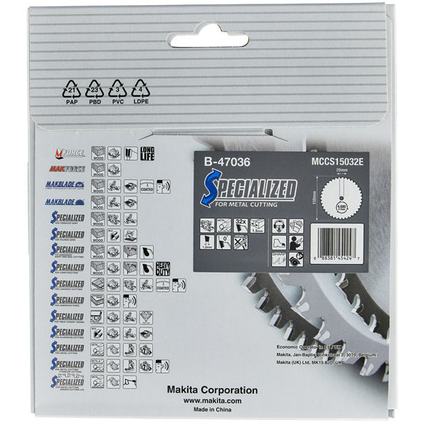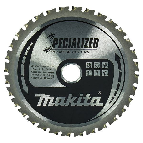 SPECIALIZED circular saw blade with 150mm diameter for cutting metal. The blade has tungsten carbide tipped 32 teeth, a kerf of 1.5mm and hole diameter of 20mm. Suitable for sawing metals with a thickness of 1mm to 3mm.