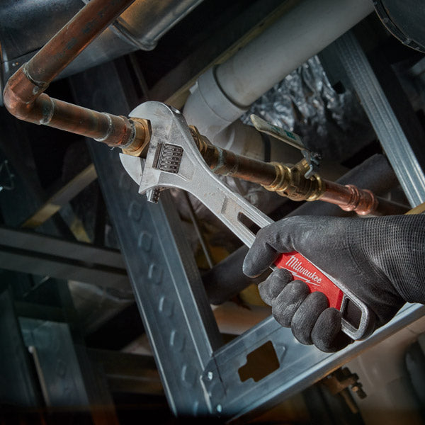 The Milwaukee Adjustable wrench has been designed from the ground up to offer maximum productivity to the professional user. The adjustable wrench features a proprietary adjustment screw for jaws that won’t back off. The ergonomic handle form has been designed for maximum comfort and won’t dig into the palms, and is chrome plated for rust protection and maximum tool life.