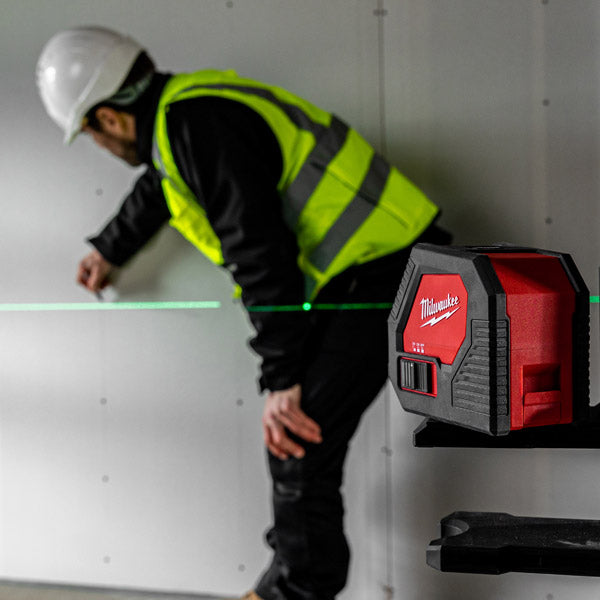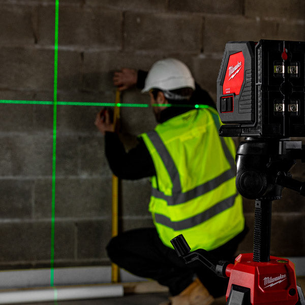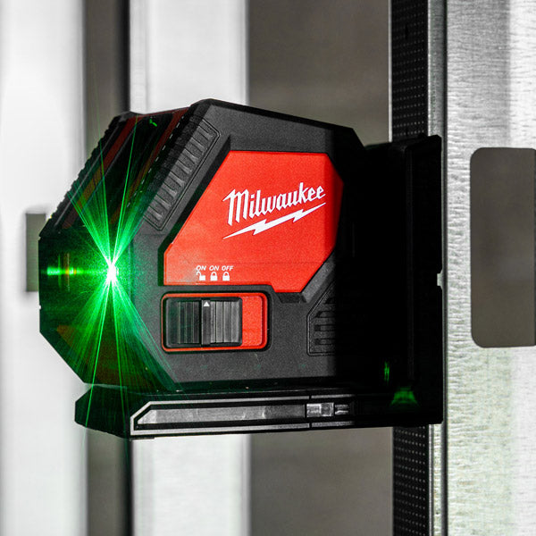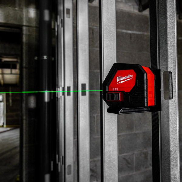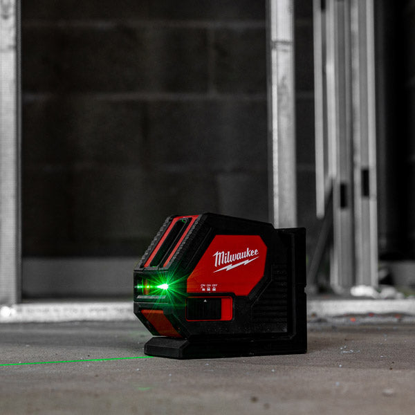 The Milwaukee Green Cross Line Laser provides 8+ hours of runtime for all-day brightness and is powered by (4) AA batteries. The high-intensity laser beams allow our users to see the green lines up to 100' for fast and accurate levelling and alignment. The integrated magnetic bracket features amplified rare earth magnets for a stronghold on metal surfaces while the screw and nail hang holes make setup easy and efficient in any environment.