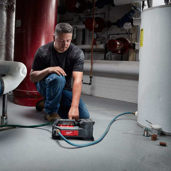 The M18BTP M18 compact transfer pump is a cordless 18V transfer pump with 3.4kg in weight making it lighter than corded transfer pumps with equal performance. The top mounted carry handle allows the usr to pick up and carry the tool witth ease, letting you use in on multiple tasks around the jobiste and save time while doing so as there's no need to unplug the pump or find a plug socket.