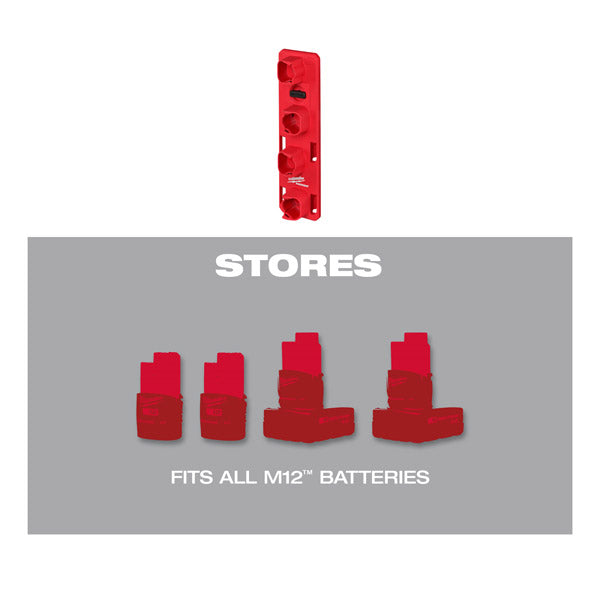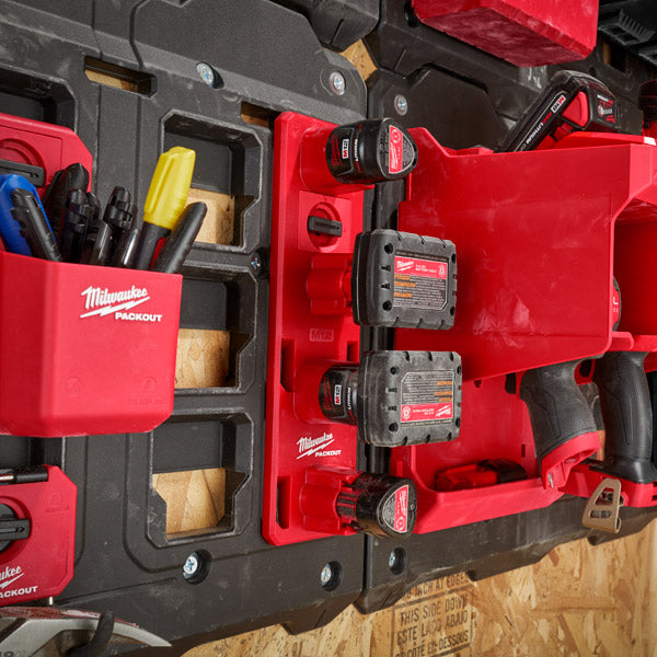 Milwaukee's PACKOUT™ M12 Battery Rack delivers the most secure mounting when paired with PACKOUT™ Wall Plates, strongly holding the PACKOUT™ solution mounted to the wall. This Battery Rack features clip-in battery storage to keep your batteries securely held in place and is optimized to store up to four M12 batteries of any size. Additionally, the Milwaukee Battery Rack features connectivity with PACKOUT™ solutions allowing you to fully customize your shop, MILWAUKEE® PACKOUT™ is the industry's most versatile and durable modular storage system.