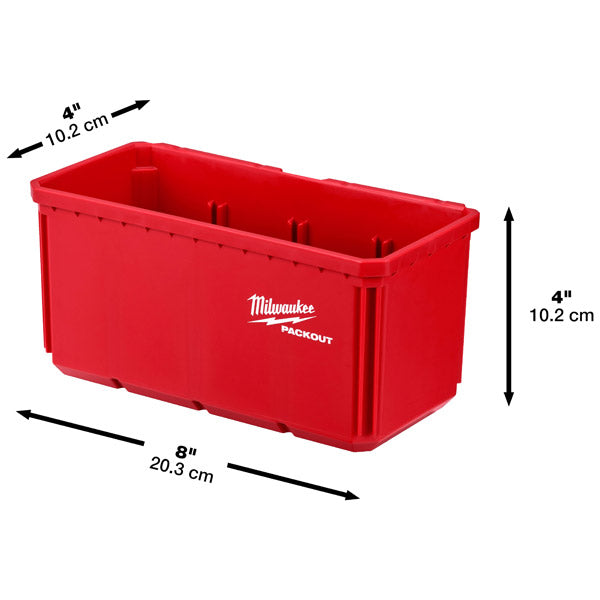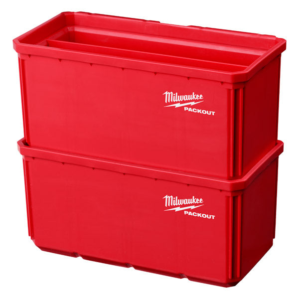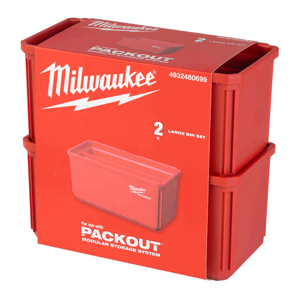 Milwaukee's 2-Pack Large Bin Set for PACKOUT™ can be stored inside MILWAUKEE® PACKOUT™ Organizers and Compact Organizers and hung on Mounting Plates. Constructed with an impact resistant body, these bins are built to withstand harsh jobsite conditions. Each large bin features a removable interior organization tray to organize jobsite supplies. These large storage bins can be used to organize and store small items like fittings, fasteners, bits, and more.