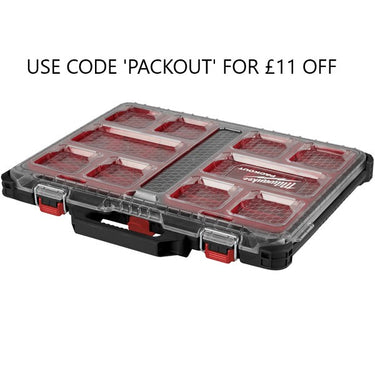 The Milwaukee PACKOUT™ slim organiser is a compact storage solution compatible with the PACKOUT™ modular storage system. This slim storage case contains 10 bins in total each with dividers perfect for storing your Milwaukee accessories such as drill and screwdriver bits, small blades and much more.