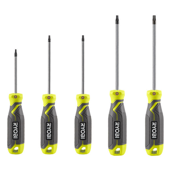 The RYOBI 5 PC. Torx Screwdriver Set is designed with the most common bits needed. The magnetic hold increases fastener retention. The tip identifier and anti-roll design aid in easy identification and keeping the screwdriver in place. This screwdriver is chrome plated for corrosion resistance.