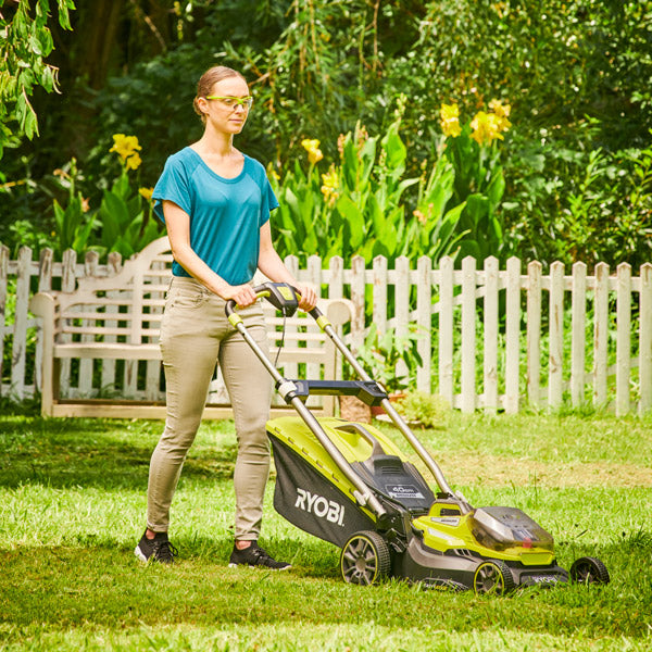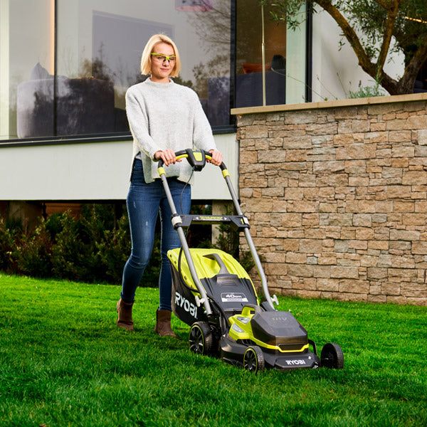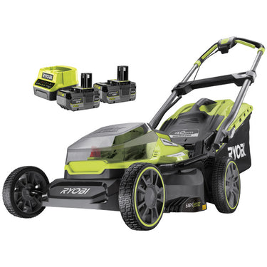 This kit contains the RY18LMX40A ONE+ Brushless 40m Lawnmower, two 4.0Ah batteries and a charger.