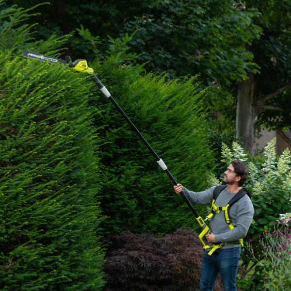 No need for a ladder, the Ryobi 18V 45cm Pole Hedge Trimmer extends to 2.9m to reach the highest areas of your garden. Featuring a 115° four-position articulating head with 45cm diamond ground blade ensures you can maintain the same great standard even when cutting the highest or hard-to-reach hedges. The innovative HedgeSweep attachment offers easy removal of clippings, keeping your hedge healthy and looking tidy. Supplied with a shoulder strap and weighing under 5kg, it’s easily handled despite its long reach.