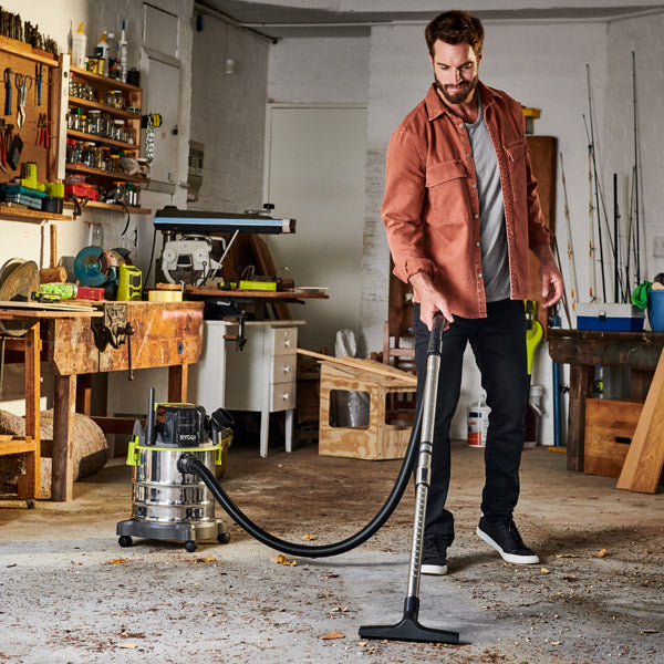 Designed with portability in mind, the ONE+™ Wet & Dry Vac offers impressive performance with 82 Air Watts of suction which can easily be used for water, wet debris, dry debris or even as a workshop blower. The 18L capacity stainless steel body provides a lightweight, compact and sturdy base which is ideally suited to any workshop environment. Caster wheels ensure easy portability and storage while the innovative onboard tool storage allows clever storage for the supplied crevice and brush tools. Also supplied with a universal power tool adaptor which is compatible with dust extraction ports on all Ryobi ONE+™ tools as well as other brands.